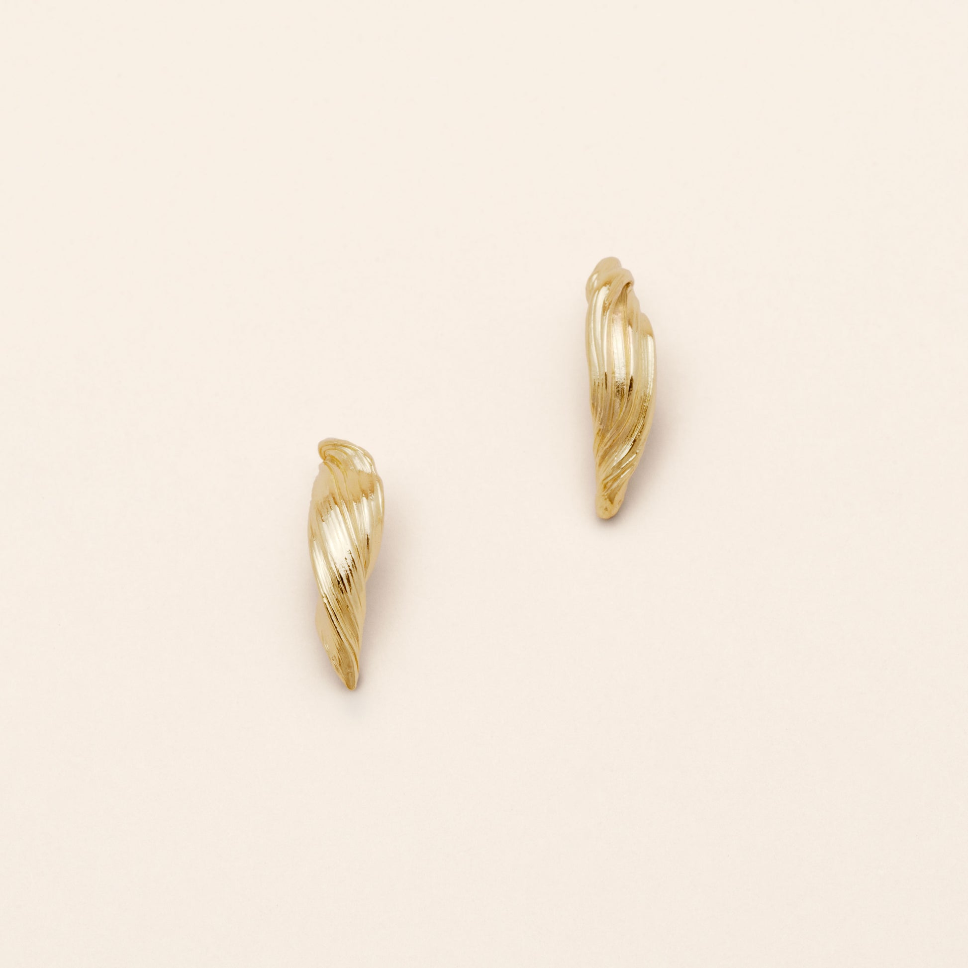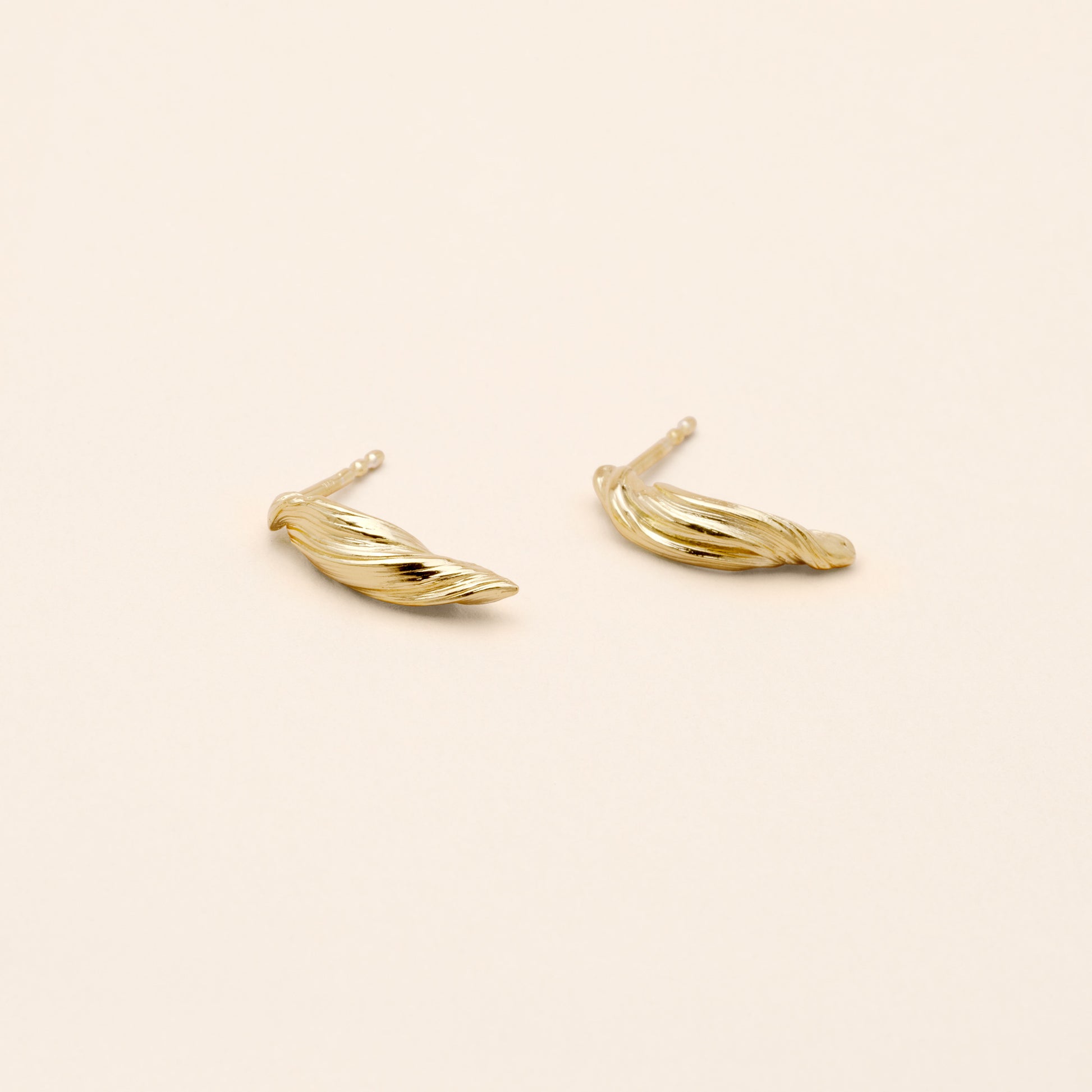 Náušnice Volute 01 zaujmou jemnou organickou texturou a tvarem připomínajícím záhyby látky. Jsou vytvořeny tradiční japonskou technikou vosku mitsuro hikime, díky níž vzniká charakteristická struktura povrchu s hedvábným leskem a měkkými liniemi. Každý pár nese stopu procesu i ruky autora. V téhle verzi jde o pozlacené náušnice.