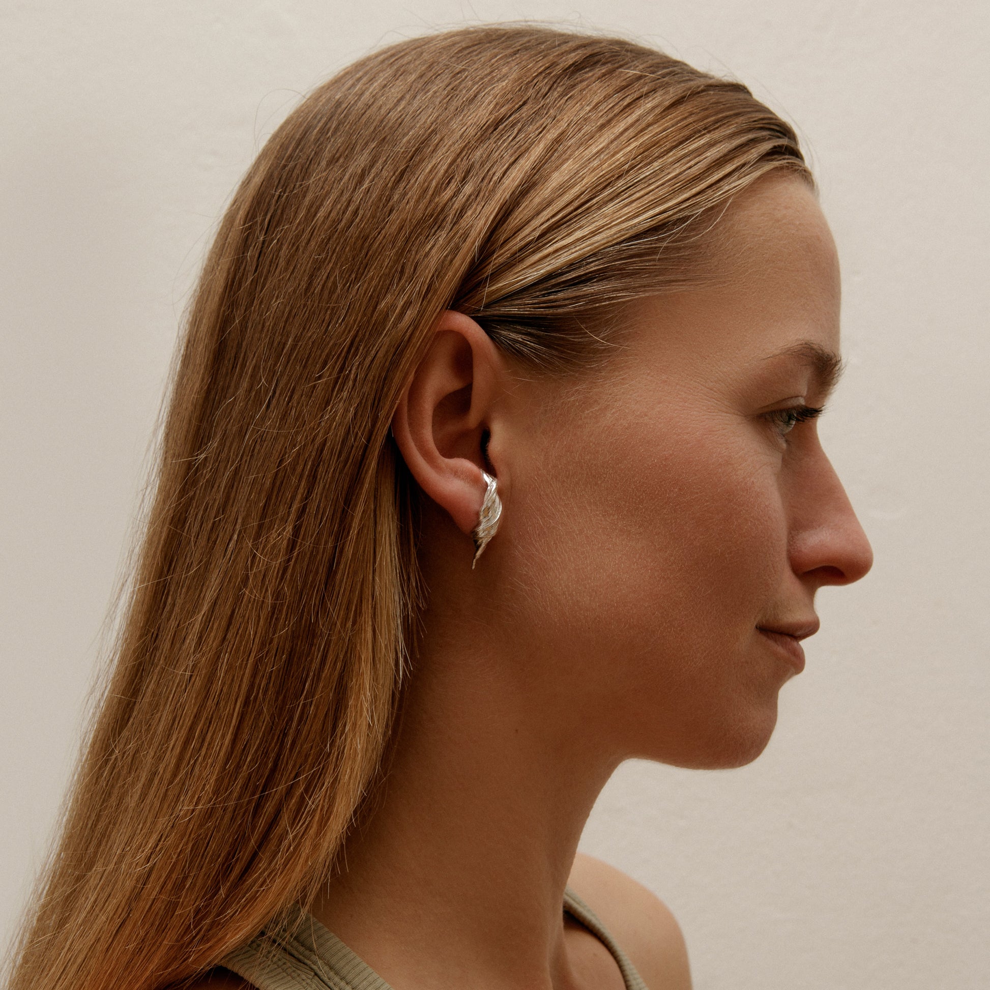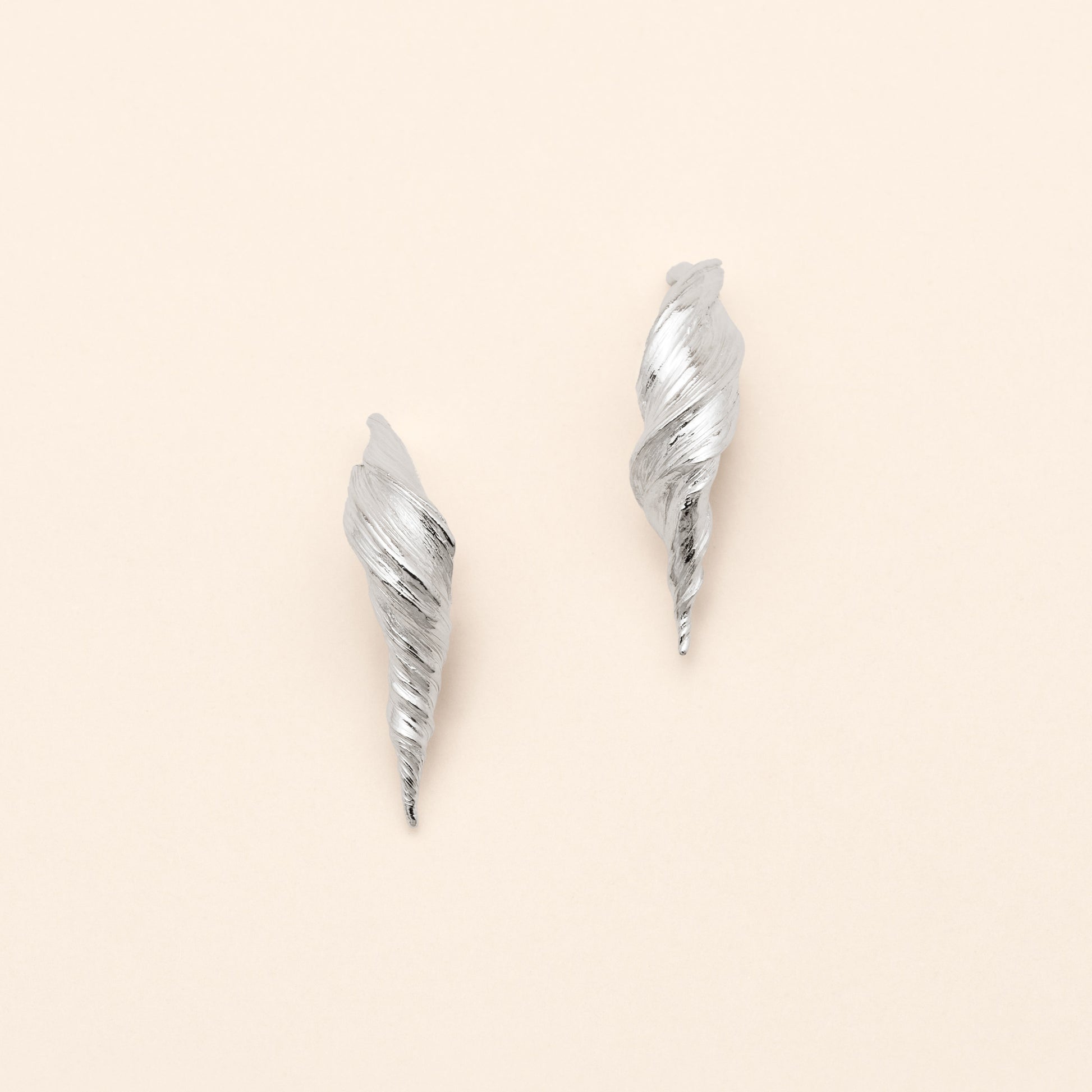 Náušnice Volute 02 zaujmou jemnou organickou texturou a tvarem připomínajícím záhyby látky. Jsou vytvořeny tradiční japonskou technikou vosku mitsuro hikime, díky níž vzniká charakteristická struktura povrchu s hedvábným leskem a měkkými liniemi. Každý pár nese stopu procesu i ruky autora.