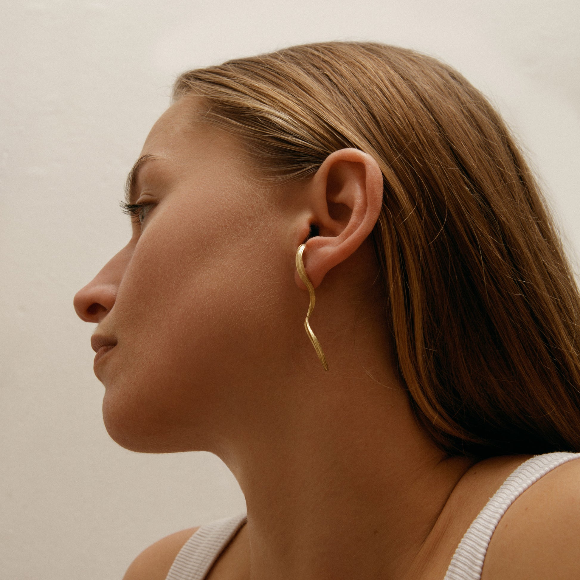 Náušnice Volute 04 zaujmou jemnou organickou texturou a tvarem připomínajícím záhyby látky. Jsou vytvořeny tradiční japonskou technikou vosku mitsuro hikime, díky níž vzniká charakteristická struktura povrchu s hedvábným leskem a měkkými liniemi. Každý pár nese stopu procesu i ruky autora. V téhle verzi jde o pozlacené náušnice.